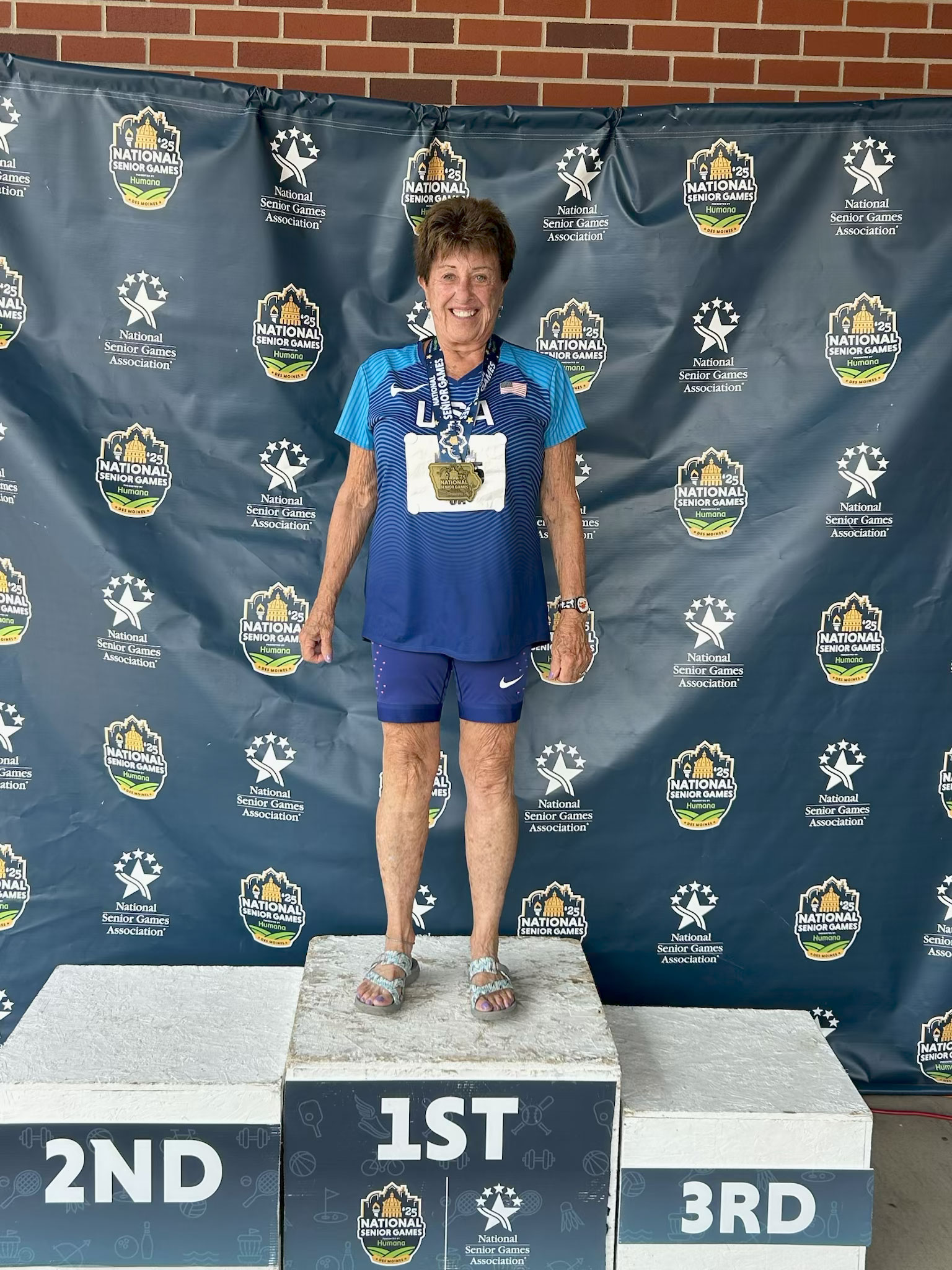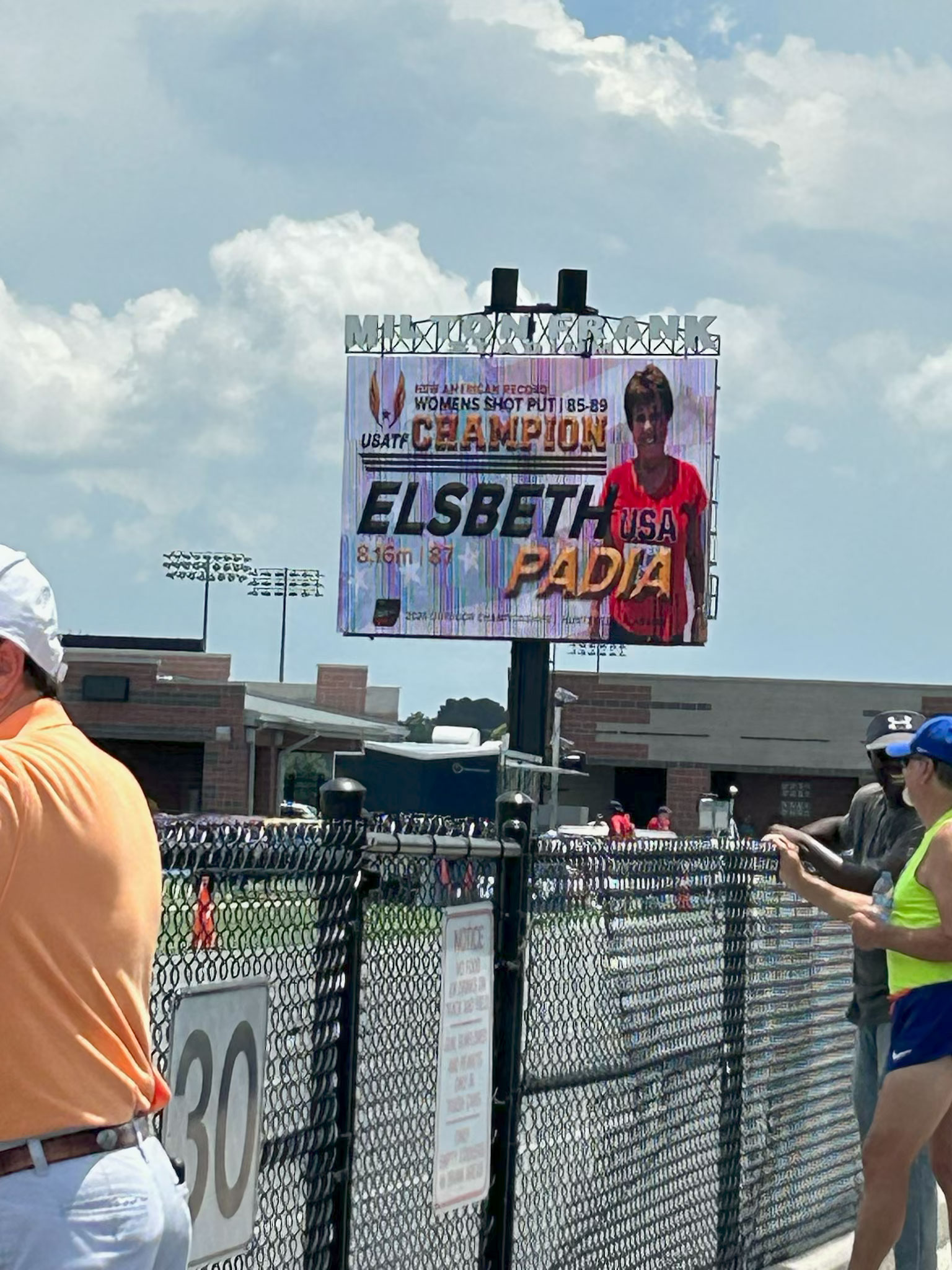 Women's Shot Put (W85-89): 7.72 meters. Old record: 7.42m (by Elsbeth Padia, set on July 13, 2023 in Pittsburgh). She also owns the American W75-79 and W80-84 records in the shot put.